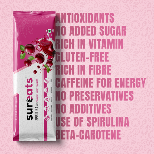 Our wellness bar combines the nutrient-packed benefits of spirulina with other healthy ingredients like cranberries, cashews, and sugar-free white chocolate, making it an easy and tasty way to stay energized and nourished.